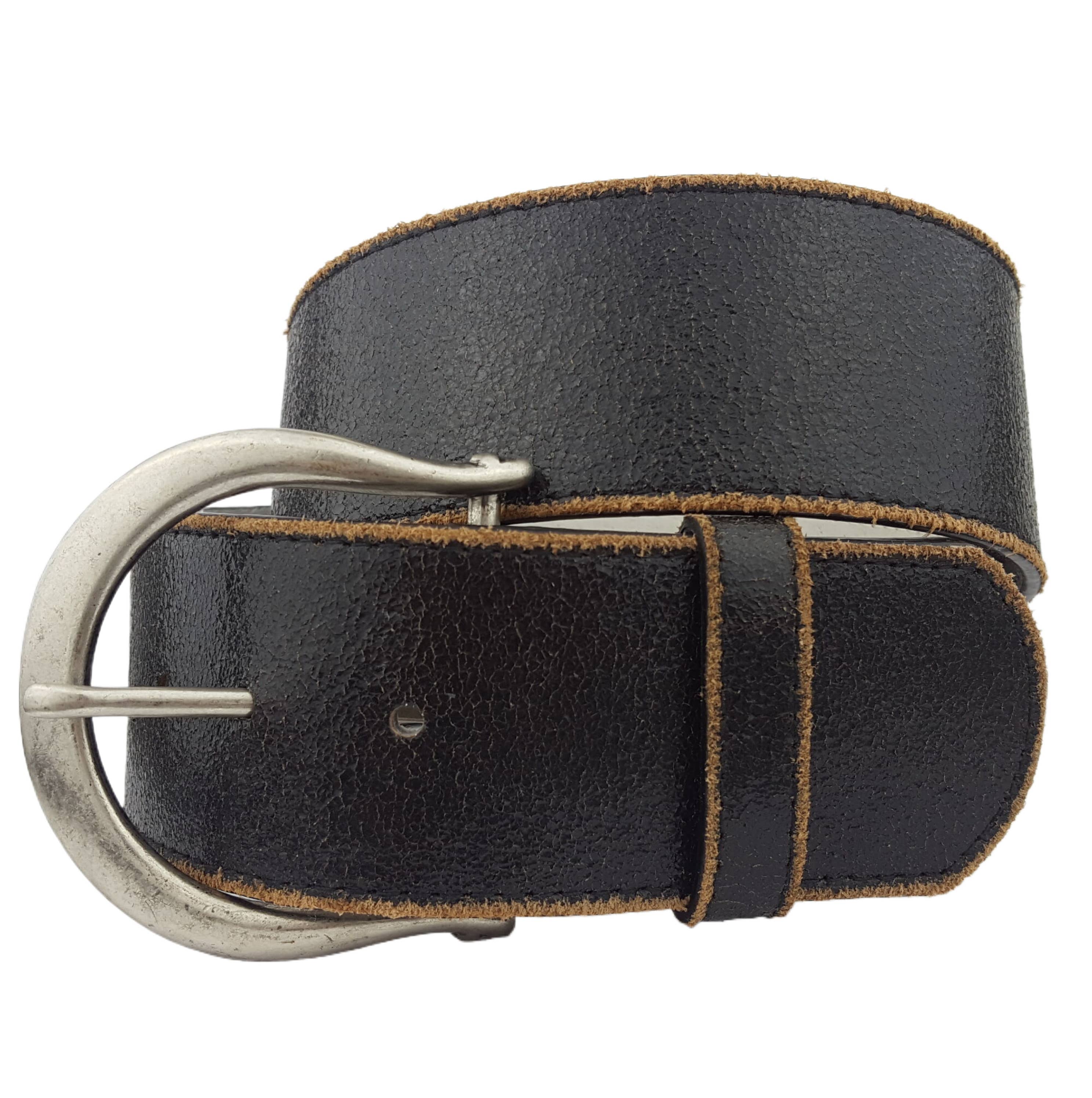 Wide Width Belt in a vintage/distressed genuine leather. Buckle is an antique silver metal plating. Quality vintage leather, and edge is sanded-off to show the distress look. Measurement of of Strap from the start to the middle hole S/M: 32", M/L: 35", L/X: 38", and From the middle hole to the tip end is 5" more. For example, total strap length of M/L will be 35" + 5" = 40".