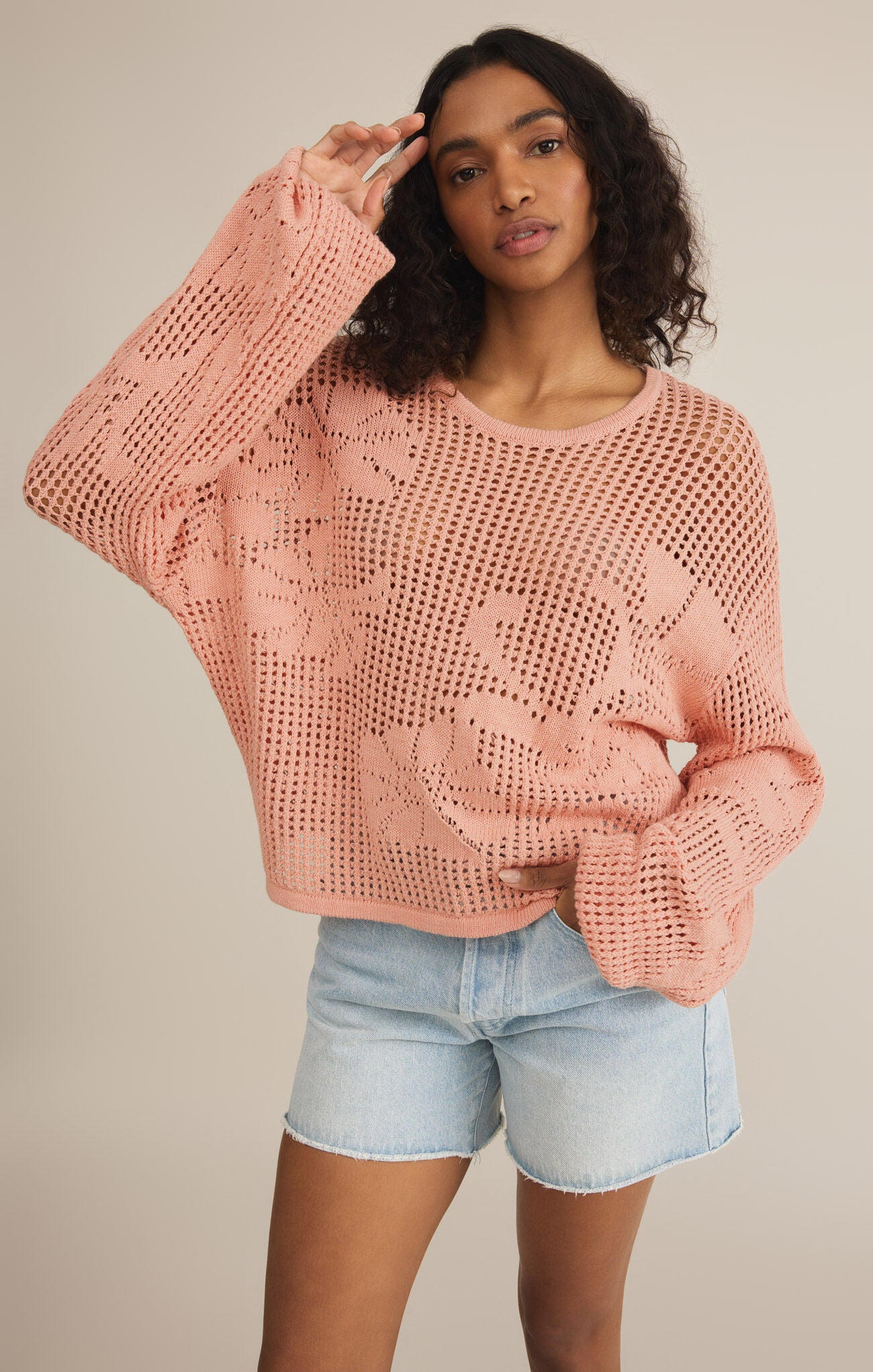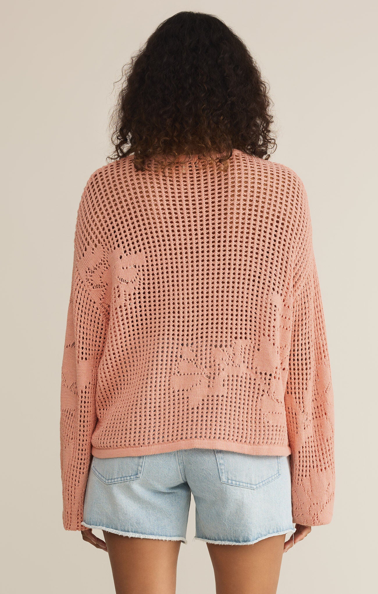 Light and airy, this mesh crew neck sweater features a delicate floral pattern and drapey, relaxed sleeves. It’s the kind of piece you’ll wear on repeat for its effortless, romantic feel.